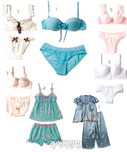 1 장미 코사지가 달린 하늘색 레이스 브래지어 5만5천원, 팬티 2만원, 폼페어.