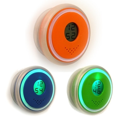 방수만 잘 된다고 다 같은 욕실 시계가 아니다. 이 제품은 깔끔한 디자인에 알람과 매시 정각을 알려주는 차임 기능은 물론, 정면의 버튼을 누르면 불이 들어오면서 영어로 시간을 말해준다. 재질은 실리콘이며 전원은 AAA 건전지 3개를 쓴다. 색상은 오렌지, 그린, 블루 3가지며, 가격은 1만 5,000원