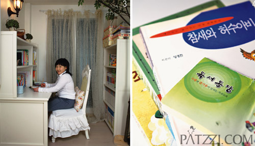 캐노피가 드리워진 침대, 큼직한 거울이 달린 화장대, 앤티크풍의 스탠드…. 주연 이의 방에는 그 또래 여자 아이들이 좋아할 만한 화이트 가구로 가득하다. 반면 책 상과 책장, 그 밖에 학습에 관련된 가구는 한눈에 들어오지 않는다. 방 한쪽 구석 진 곳에 자리하고 있기도 하거니와, 4칸짜리 미니 책장에 100권도 채 되지 않는 책 들이 듬성듬성 꽂혀 있기 때문이다. 공부방에 들어서면 책장에 꽂힌 책들이 가장 먼저 눈에 들어오는 법인데 그렇지 않은 주연이의 방은 공부방이라고 하기보다 침 실에 가깝다.