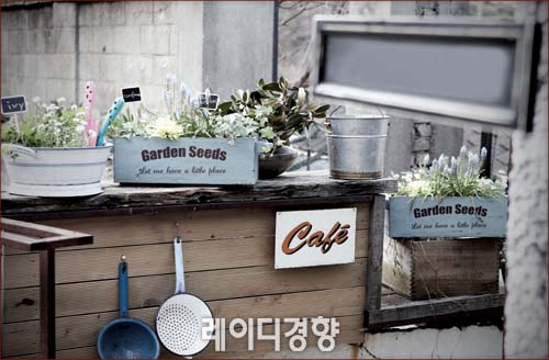 자연을 닮은 컨트리 인테리어에서 꽃과 식물은 빼놓을 수 없는 요소. 마당 한켠에 미니 가든을 꾸며 자연의 싱그러움을 느껴보자. 나무 박스나 양철통에 작은 화분을 여러 개 담고 식물 이름을 적은 미니 칠판꽂이로 장식하면 손쉽게 정원 느낌을 연출할 수 있다. 여기에 낡은 법랑 소품이나 사인보드 등 빈티지 소품을 곳곳에 매치하면 더욱 멋스럽다.