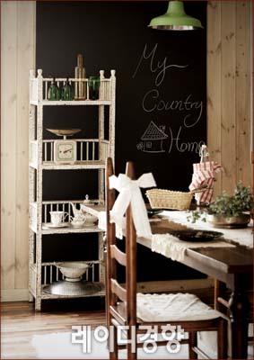 컨트리풍 주방의 특징은 주방 소품을 감추기보다 드러내어 수납하는 것에 있다. 빈티지 오픈 수납장이나 앤티크 그릇장을 활용해 그릇과 소품을 수납하면 아기자기한 컨트리 스타일을 연출할 수 있다. 식탁은 원목 제품이 잘 어울리는데, 나무의 느낌이 잘 살도록 테이블보보다는 러너 정도만 활용하는 것이 좋다. 화이트 빈티지 수납장 55만원, 대부앤틱.