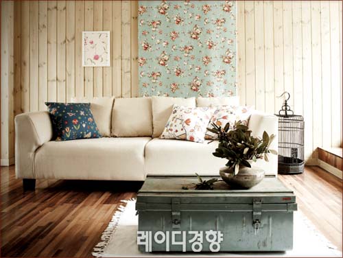 거실 벽을 나무 패널로 마감하면 통나무를 자른 널빤지로 벽을 만들었던 초기 컨트리 스타일의 느낌을 재현할 수 있다. 여기에 로맨틱한 꽃무늬 패브릭을 포인트로 매치해 낭만적인 분위기를 연출한다. 소파는 가죽보다는 천이, 튀는 색보다 무난한 색이 어울리며 여러 가지 패턴의 쿠션으로 포인트를 주는 것이 좋다. 거실 테이블이나 소품은 빈티지한 것으로 선택하면 편안한 정감을 더할 수 있다. 화이트&블루 쿠션 가격미정, style-k. 블랙 새장 13만원, 대부앤틱.