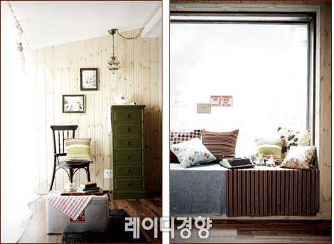 컨트리 인테리어의 매력 중 하나는 바로 자유로움이다. 컨트리풍 공간에서 이질적인 아이템의 믹스 매치는 부자연스럽기보다 오히려 멋스럽다. 앤티크 의자와 서랍장으로 꾸민 사이드 공간에 테이블로 캐주얼한 철제 아이스박스를 놓아 자유로운 멋을 연출했다. 그린 앤티크 서랍장 65만원, 아시안데코. 블랙 앤티크 의자 30만원, 대부앤틱.