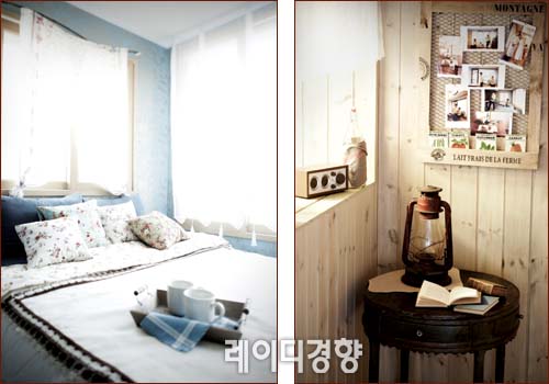 컨트리 하우스의 낭만이 가장 잘 묻어나는 공간인 침실. 컨트리를 대표하는 패턴인 잔잔한 꽃무늬 쿠션과 로맨틱한 멋을 더하는 레이스 커튼, 내추럴한 손뜨개 장식의 베드 스프레드 등으로 사랑스러운 분위기를 연출했다.