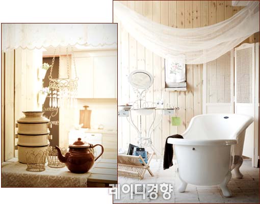 법랑 찬합과 주전자 등 빈티지 소품은 컨트리한 공간의 느낌을 잘 살리는 아이템이다. 허전한 주방 창가에 빈티지 소품을 놓아 포인트를 주고 레이스나 잔잔한 꽃무늬 미니 커튼을 달아 로맨틱한 멋을 더한다.