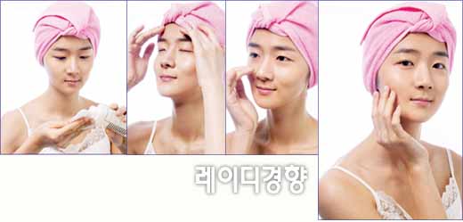 a 세안한 뒤 토너를 화장솜에 묻혀 위에서 아래로 닦아내리듯 바른다. 그 다 음 토너가 피부에 잘 스며들도록 손바닥으로 여러 번 두드린다. b 피부 깊숙 이 고농축의 영양 성분을 전달하는 보습 화이트닝 에센스를 손에 덜어 얼굴 전체에 원을 그리듯 마사지하며 바른다. c 에센스 성분이 제대로 효과를 보려 면 피부에 보습막을 형성해주는 모이스처라이징 단계는 필수. 크림을 적당량 덧바른다. d 아이크림으로 다크서클과 눈가 부기를 완화하고 기초 화장에서 가장 중요한 단계인 자외선 차단제도 잊지 말고 바르도록 하자.
