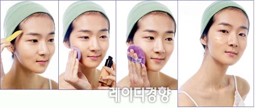a 눈썹이 고르지 않으면 베이스 케어 전에 눈썹 정리부터 하자. 이때 진동 눈 썹정리기를 사용하면 5초면 OK. b 메이크업베이스와 파운데이션을 손바닥에 적당량 덜어 1:1 비율로 섞어 검지와 중지를 이용해 얼굴 전체에 바른다. c 유분기가 없는 매트한 파우더를 덧발라 마무리한다. 이때 트윈케이크는 잔주 름을 유발하기 쉬우므로 생략한다. d 베이스 화장을 마친 뒤에는 티슈나 퍼프 로 얼굴을 전체적으로 한 번 눌러주면 시간이 지나도 번들거리지 않고 화장이 오래 지속된다.