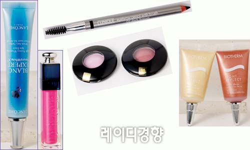 1 블랑 엑스퍼트 화이트닝 스폿 이레이저 기미와 잡티 등을 효과적으 로 제거하는 제품으로 색조 화장 전에 사용하면 된다. 11만5천원, 랑콤. 2 어딕트 울트라-글로스(267호, 새틴핑크) 끈적임 없이 부드럽게 발리며 반 짝임이 오래 지속되는 립글로스. 3만2천원, 디올. 3 아이브로우 펜슬 위드 브러시(02호, 다크브라운) 자연스러운 눈썹을 위한 아이펜슬로 아이라인 을 그릴 때 사용해도 좋다. 1만6천원, 크리니크. 4 컬러 포커스(362호, 핑 크·239호, 브라운) 지속력과 발색력이 뛰어난 아이섀도. 볼터치와 눈화 장에 모두 사용 가능하다. 각 2만7천원, 랑콤.