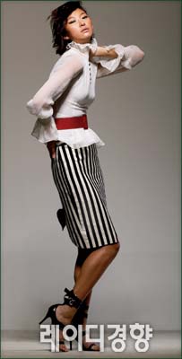절제된 느낌을 주는 스트라이프 펜슬스커트에 로맨틱한 화이트 시폰 블라우스를 매치하고 레드 와이드 벨트로 포인트를 주었다. 화이트 시폰 블라우스·스트라이프 펜슬스커트·레드 벨트 가격미정, 라튤. 블랙 스트랩 슈즈 가격미정, how and what. 귀고리 2만원, 도니아.