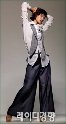 그레이 아코디언 플리츠 팬츠에 베스트가 달린 화이트 셔츠를 받쳐 입어 매니시 스타일을 연출했다. 화이트 셔츠&베스트 세트 가격미정, 양성숙. 그레이 아코디언 플리츠 팬츠 가격미정, 라튤. 귀고리 가격미정, 홍은 주얼리. 벨트 가격미정, Lab#0428. 실버 스트랩 슈즈 가격미정, 박윤정.