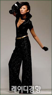 타이트한 블랙 새틴 셔츠에 자카드 소재 팬츠를 매치하고, 원통 모양 가방과 장갑으로 포인트를 주어 액티브한 느낌을 살렸다. 블랙 새틴 셔츠·자카드 팬츠·목걸이·장갑·가방 가격미정, how and what. 벨트 가격미정, 문영자.
