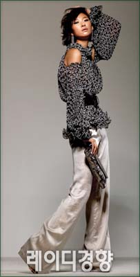 베이식한 디자인의 베이지 새틴 팬츠에 어깨가 드러나는 시폰 프린트 블라우스를 받쳐 입어 로맨틱하면서도 섹시한 이미지를 더했다. 시폰 프린트 블라우스·베이지 팬츠 가격미정, 기옥. 블랙 벨트 가격미정, how and what. 귀고리 3만2천원, 클러치백 5만5천원, 도니아.