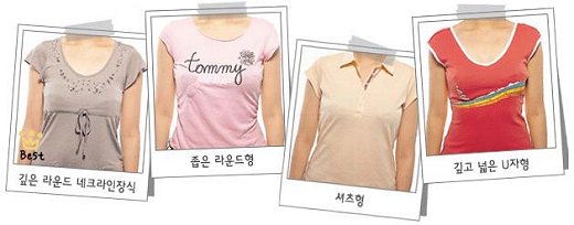 좁은 라운드형 기본적인 네크라인으로 답답해 보일 뿐 아니라 어깨는 넓고 팔뚝은 통통해 보인다.