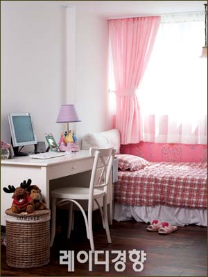 딸의 방은 로맨틱한 핑크 컬러로 꾸몄다. 핑크톤의 커튼과 포인트 벽지, 침구 세트 역시 사랑스러운 분위기를 더한다.