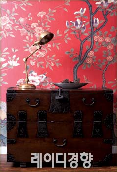 1 앤티크 가구를 좋아하는 김남수씨가 20여 년 전 인사동에서 구입한 반닫이. 대동벽지의 ‘청연 화조도’ 벽지와 어우러져 오리엔탈 코너를 연출했다.