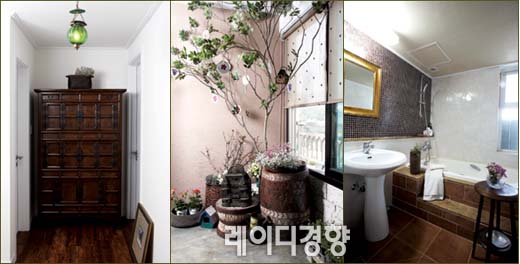 입구에서 현관으로 이어지는 공간인 전실에 커다란 나무와 아기자기한 화초를 놓아 첫인상부터 감탄을 자아내게 하는 집.