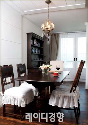다이닝룸 창문 역시 목공으로 맞춤 제작했다. 리넨과 레이스 커튼은 김남수씨 가 가장 마음에 들어하는 아이템. 그릇을 수납하는 드레서와 식탁은 프랑스 앤 티크 가구로 선택해 로맨틱한 다이닝 룸을 연출했다.