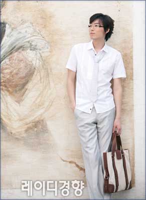 (man) 심플한 화이트 셔츠와 실버 컬러 팬츠로 샤프하면서도 지적인 느낌 연출. 타이를 팬츠와 같은 실버 컬러로 통일한 것이 멋스럽다. 가방은 커다란 빅 사이즈가 안성맞춤. 셔츠·팬츠 10만원대, 지오지아. 타이 4만원대, 헤라스톤. 비즈니스 백 20만원대, 올젠.