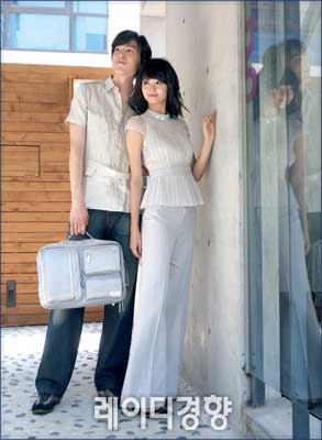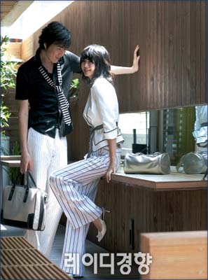 (woman) 하늘거리는 시스루 소재의 실버 블라우스 셔츠. 허리선이 약간 위쪽으로 올라온 엠파이어 라인 디자인으로 섹시함이 물씬 풍긴다. 팬츠를 셔츠와 같은 실버 컬러로 통일해 다리선이 더욱 날씬해 보이는 효과를 준다. 블라우스 셔츠·팬츠 20만원대, YK038.