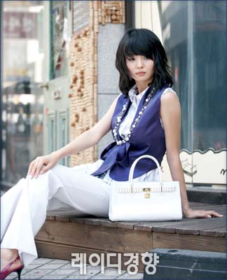 (woman) 화이티 컬러의 스트라이프 셔츠와 같은 컬러의 팬츠로 연결감이 살아나는 스타일링. 여기에 새틴 소재 블루 컬러 베스트로 포인트를 주었다. 베스트 6만9천원, 허스트. 셔츠 10만원대 AK 앤클라인. 팬츠 20만원대, 아니베에프. 토트백 20만원대, 펠레보르사.