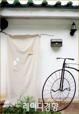 리넨의 가장 큰 매력은 자연스러운 멋이다. 안뜰 한쪽 벽면에 발처럼 베이지 리넨을 길게 늘어뜨려 편안하면서도 내추럴한 공간을 꾸몄다. 밋밋한 리넨에 영문 패턴 스탬프와 낡은 엽서로 장식하고 지지대로 나뭇가지를 사용해 포인트를 준 것이 특징. 앤티크 자전거와 철제 우체통을 매치해 빈티지한 멋도 한껏 살렸다. 철제 우체통 5만8천원, 꼬끄에꼬숑. 나머지는 스타일리스트 소품.