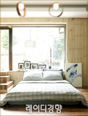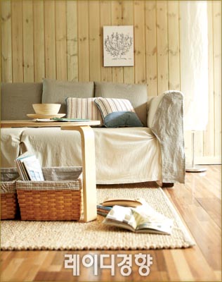 리넨은 질긴 성질의 섬유로 움직임에 의해 해지기 쉬운 소파 커버 원단으로 적합하다. 베이지 리넨으로 소파를 전체적으로 커버하고 그레이 리넨을 쿠션 커버와 소파 앞면 장식으로 사용해 안정감 있으면서도 세련된 멋을 연출했다. 스트라이프 패턴 블루 쿠션 각 1만6천2백원, Market m. 브라운 필통 8천5백원, 오프타임. 나머지는 스타일리스트 소품.
