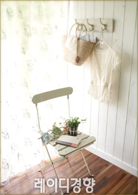 자연적인 느낌의 리넨은 보는 것만으로 마음을 평안하게 만드는 효과가 있다. 의자 모양이 프린트된 리넨 커튼과 레이스 장식의 리넨 블라우스로 내추럴한 휴식 공간을 연출했다. 베이지 리넨 커튼 27만9천원·노트 6천5백원, 오프타임. 화이트 철제 의자 11만2천원, 베이지 스트로 숄더백 4만5천원, 꼬끄에꼬숑. 화이트 옷걸이 2만6천원, at-corner. 나머지는 스타일리스트 소품.