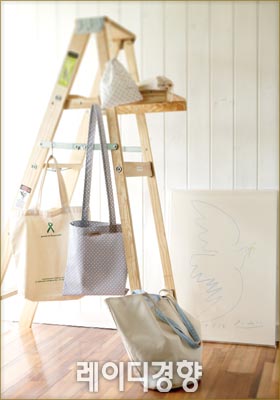 캐주얼한 멋을 연출하는 다양한 패턴의 리넨 가방은 실용적이라 더욱 매력적이다. 왼쪽부터 베이지 토트백 7천5백원·그레이 도트 프린트 숄더백 1만1천원·블루 도트 프린트 주머니 5천원·베이지 필통 주머니 8천5백원·액자 18만원, 오프타임. 바닥에 놓인 베이지&블루 스트라이프 패턴 양면 숄더백 2만7천원, Market m.
