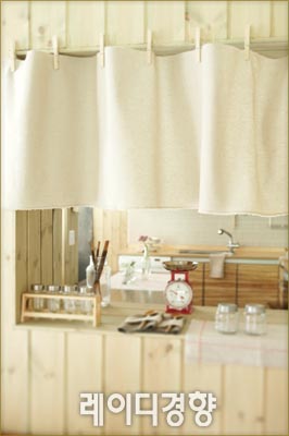 주방 창가에 나무 집게와 자투리 리넨으로 연출한 아이디어 미니 커튼. 리넨 밑단의 올을 조금씩 풀면 한층 더 자연스럽게 연출된다. 젓가락이 담긴 유리병 6천원, at-corner.