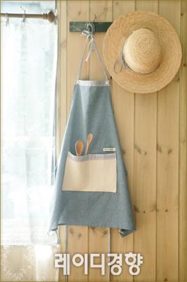 세탁이 쉽고 내구성이 강한 리넨은 앞치마 소재로도 그만이다. 주머니가 달린 블루톤의 앞치마를 주방 한쪽 벽에 밀짚모자와 함께 걸어두면 전원풍의 데코 효과도 얻을 수 있다. 앞치마 1만9천5백원, Market m. 밀짚모자 4만2천원, 꼬끄에꼬숑. 나머지는 스타일리스트 소품.