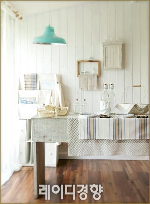 다른 어떤 패브릭보다 주방과 잘 어울리는 리넨. 내추럴한 컬러와 패턴의 리넨 소품으로 빈티지 컨트리 스타일 주방을 연출했다. 특히 리넨은 세탁하기 쉬울 뿐 아니라 음식 얼룩이나 때를 바로 흡수, 식탁을 보호하기 때문에 테이블클로스나 러너로도 활용하기 좋다. 화이트 빈티지 잡지꽂이 28만원·브라운 액자 프레임 2만2천원·화이트 키홀더 박스 3만5천원·철제 바구니 유리병 세트 2만9천원(개당 9천5백원), at-corner. 화이트 앞치마 3만2천5백원·블루 도트 프린트 주머니 5천원, 오프타임. 나