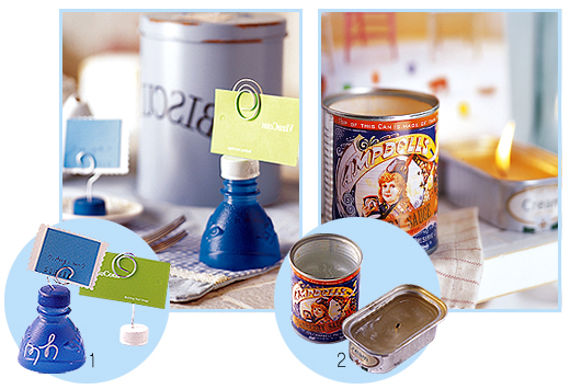 ▶ 컬러가 있는 페트병으로 만든 네임 홀더는 손님을 초대했을 때 내놓아도 손색없을 정도로 재미있는 리폼 아이디어. 페트병 의 뚜껑 컬러를 달리하면 분위기가 새로워진다.