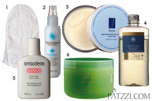 촉촉하게 피부에 물 주기 샤워 후에는 크리미한 느낌의 보디 크림을 아낌없이 발라준다. 쓰다 남은 영양 크림이나 에센스를 보디 크림에 섞어 바르는 것도 효과적이다. 평소에는 자외선 차단과 유수분 공급 효과가 있는 보디 스프레이 를 들고 다니며 틈틈이 뿌려준다. 슬리브리스나 유행하는 짧은 스커트, 혹은 쇼츠를 입을 때는 촉촉함과 함께 반짝이는 광택을 주는 보디 로션을 피부결을 따라 마사지하듯 바른다.