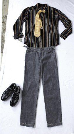블랙 컬러 멀티스트라이프 셔츠에 고급스러운 디테일의 데님 팬츠를 추천한다. 거기에 실크 소재 넥타이와 실버 메탈 워치를 매치, 마지막으로 블랙 스니커즈를 신어라. 군더더기 없는 아이템 선택하는 것이 최고의 키 포인트다. 막스앤스펜서 타이 9만5천원,소다 신발20만8천원 타이맥스 시계 14만5천원
