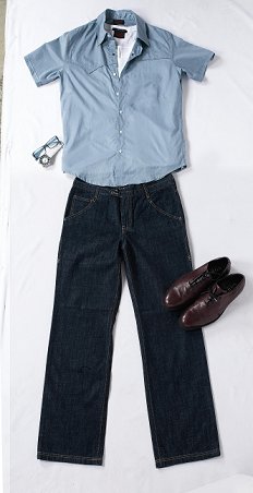 블루 컬러 반소매 셔츠와 화이트 브이넥 티셔츠의 궁합은 완벽하다. 거기에 생진을 입으면 스마트한 남자로 변신이 가능하다. 티셔츠 컬러에 맞춘 프레임의 안경, 화이트 밴드의 워치, 마지막으로 고급스러운 와인 컬러 레이스 업 슈즈로 마무리 하면 스타일링 노하우는 이것으로 END! 알랭미끌리 안경 40만원대 ,폴리폴리 시계26만원 소다 구두 21만8천원