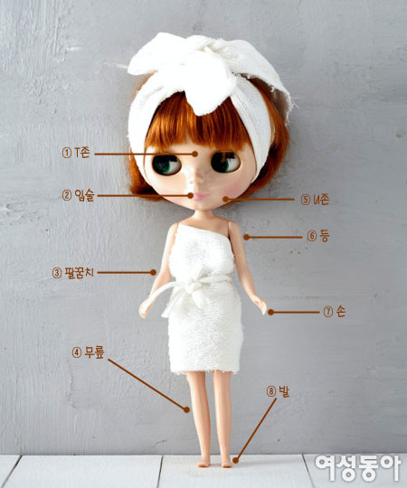 3 팔꿈치 외부로부터 자극과 마찰이 많아 각질층이 두껍고 건조한 부위이므로 수분공급에 신경 쓴다. 팔꿈치를 2~3분간 스팀타월로 감싸 각질을 부드럽게 만든 다음 스크럽제로 가볍게 문질러 각질을 벗겨낸다. 각질제거 후에는 로션과 보디오일을 1:1 비율로 섞어 마사지한다.