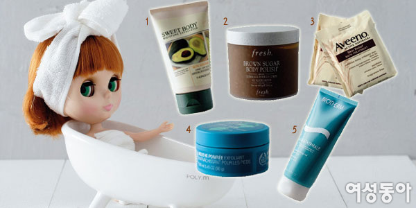 1 더페이스샵 스위트 바디 모이스처 엑스폴리에이터 호두 껍데기가루, 아보카도오일 성분이 각질을 촉촉하고 부드럽게 정돈해준다. 120ml 6천5백원. 2 프레쉬 브라운 슈거 바디 폴리쉬 여드름과 과다한 피지 분비를 진정시키고 피부 표면의 노폐물과 각질을 제거해준다. 400g 10만2천원.