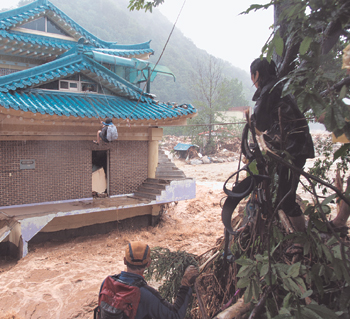 그때 영웅들이 나타났다. 김세준(37·익스트림라이더 등산학교 강사) 씨 등 전문 산악인 8명이 물살을 거슬러 오르며 마을회관 옥상으로 올라왔다. 김 씨 등은 7년여 전부터 알고 지낸 이 마을 주민 정준교(49) 씨의 집에 머물며 9월 중국 산행에 대비해 훈련을 하고 있었다.
