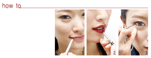 ★ advice “여러 가지 레드 립 스타일이 있겠지만 레드 컬러 글로스와 립스틱을 믹스하면 시크한 레드 립을 연출할 수 있어요. 이때 중요한 것은 글로스를 메인으로 사용하는 것이에요. 글로스 위에 립스틱을 덧바르면 선명한 레드 컬러가 촉촉하고 자연스럽게 표현되면서 매니시한 느낌을 주지요. 단, 섀도나 블러셔 등에 다른 계열 컬러는 사용하지 않는 것이 좋아요. 아이 메이크업은 블랙 라이너 하나면 충분합니다.”