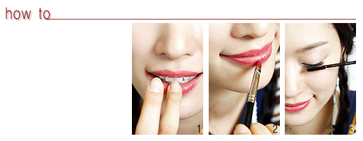 1. 레드 컬러 립글로스 또는 틴트를 입술에 전체적으로 바른 다음 립 라인은 남기고 안쪽에 레드 컬러 립스틱을 바른다. 글로스 위에 덧바르면 진한 레드 컬러가 촉촉하고 자연스럽게 표현된다.