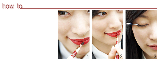 ★ advice“발랄하면서도 사랑스러워 보이려면 퓨어한 레드보다는 여성스러움이 좀더 더해진 핑크 레드가 제격이에요. 핑크가 믹스된 레드 글로스를 바르거나 퓨어한 레드 립스틱에 핑크 글로스를 믹스하는 것도 좋은 방법이에요. 이때 눈은 되도록 컬러감을 은은하게 해주세요. 펄 파스텔 섀도를 원 톤으로 바르고 블랙 마스카라를 풍성하게 발라 눈매를 깔끔하게 표현하세요.”