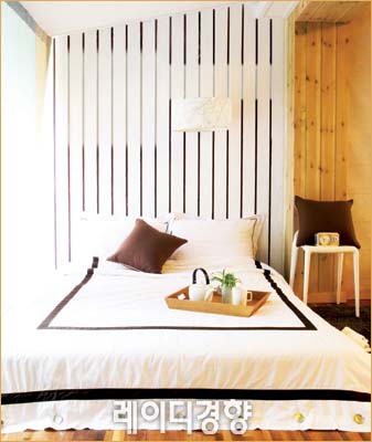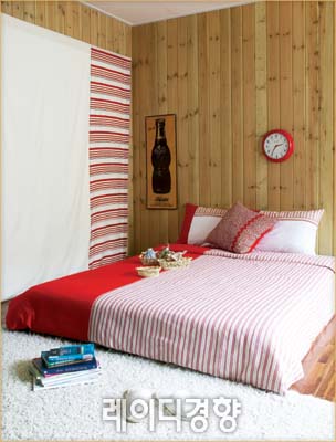 젊은 감각의 캐주얼 스타일 침실을 꾸미고 싶다면 스트라이프나 체크 패턴의 침구를 선택하자. 스트라이프나 단순한 패턴이 반복된 프린트 침구는 아이들 방에도 잘 어울리지만 부부 침실 분위기도 새롭게 연출할 수 있다. 강렬한 레드 침구로 원색으로 된 부분과 스트라이프를 적절히 믹스해 캐주얼하면서도 깔끔하고 고급스럽다. 레드 스프라이프 베딩 세트 14만8천원. 레드 스프라이프 커튼 8만4천원, 인더지.
