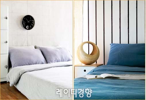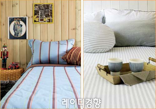 1 옅은 블루에 얇은 스트라이프가 경쾌하다. 스트라이프를 형광으로 표현해 얇지만 포인트를 확실히 주고, 젊은 감각을 살렸다. 그레이 블루 스트라이프 베개 커버 개당 1만1천9백원·매트 커버 2만5천9백원·이불 커버 6만9천9백원, 발렌시아가.