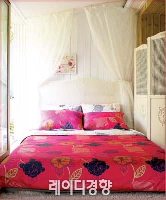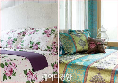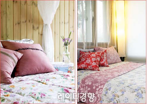 3 빅 플라워 패턴에 잔잔한 꽃잎이 흩날리는 프린트가 로맨틱한 분위기를 연출한다. 심플한 방에 포인트를 주고 싶다면 이런 침구를 사용해보는 것도 좋을 듯. 플라워 누비 세트 1만5천9백원, 모던하우스.