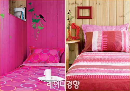 3 핫 핑크 바탕에 원 패턴이 규칙적으로 반복되어 깔끔하면서도 경쾌하다. 방이 다소 칙칙하다면 화려하고 경쾌한 느낌의 침구로 분위기를 바꿀 수 있다. 내추럴 레드 베딩 세트 스타일리스트 소품. 핑크 도트 베개 커버 개당 1만4천9백원. 매트 커버 2만9천9백원. 이불 커버 8만5천9백원, 발렌시아가.