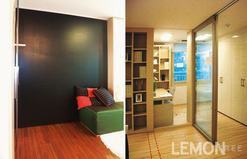 3 활용도 높인 확장 공간 작은 평수의 경우 드레스 룸이 설계된 부실을 변형해 사용. 밖에서도 안이 보일 수 있도록 가벽 대신 안전 강화유리를 설치 거실 쪽으로 간이 책장, 안으로 홈 오피스 공간을 마련했다. 래미안의 인테리어 설계 중 단연 돋보이는 것은 오피스 공간을 가족이 함께하는 공간과 매치시켰다는 점. 그래서 거실이나 서비스 공간에 서재가 빠지지 않는다.
