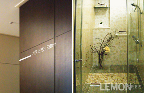 2 웰빙 기능이 추가된 욕실 욕실은 알루미늄 슬라이딩 장으로 처리했고, 2개의 간접 조명을 별도로 설치해 아늑함을 극대화했다. 욕실 부스 안, 바닥에 지압 타일을 사용한 것도 새롭다. 음식 냄새 제거를 위해 조리 주방과 차림 주방을 분리시키는 여닫이문을 설치해 주방 위생까지 고려했다.