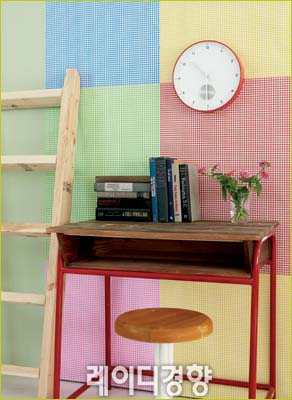여러 가지 색상의 체크무늬 원단을 패치워크해서 만든 아트월. 보기만 해도 따뜻한 느낌이 묻어나는 코지 코너가 탄생했다.