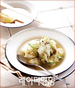5 냄비에 닭 육수를 부어 끓인 뒤 소금, 후춧가루로 간하고 대파를 어슷하게 썰어 넣어 ④의 재료를 접시에 담아 곁들여 낸다.