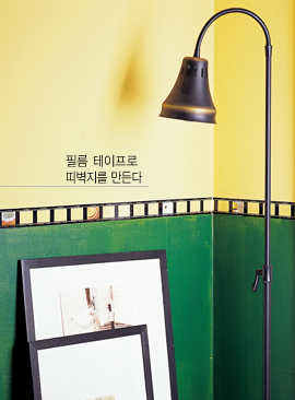위아래 벽의 컬러나 벽지가 다를 때 띠벽지 용도로 필름 테이프를 활용해 본다. 표면이 매끄러운 벽에 수평을 맞춰 가로로 붙이면 벽면을 영화의 한 장면처럼 연출할 수 있다. 테이프를 붙이기 전 안쪽에 가족과의 추억이 담겨 있는 사진을 끼워 붙이면 벽 장식이 더욱 특별해진다.